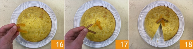 Transcurrido el tiempo de cocción, retira del horno y deja enfriar, luego desmolda la tarta y decora con naranja confitada 16 y ramas de canela 17. ¡Tu tarta dulce de arroz y ricotta está lista para ser servida 18!