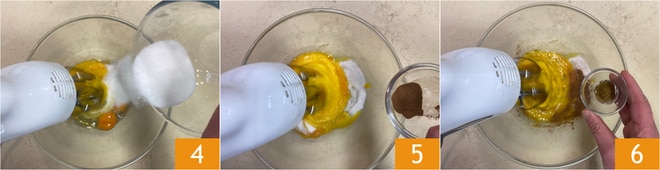 Mientras tanto, vierte en un bol los huevos y el azúcar 4, luego añade la canela 5 y el extracto de vainilla 6. Bate hasta que la mezcla cambie de color, no debe ser excesivamente aireada.