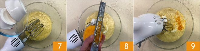 Agrega la ricotta 7, la cáscara de naranja rallada 8, una pizca de sal y mezcla nuevamente con las varillas 9 hasta obtener una mezcla homogénea.
