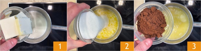 Para preparar la tarta salchichón de chocolate, lo primero que hay que hacer es dedicarse a la base. Calentad la leche en un cazo, luego añadid la mantequilla 1, el azúcar 2 y el cacao 3.
