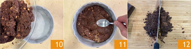 Verted todo en un molde desmontable de 22 cm de diámetro, cubierto con papel de horno 10. Presionad y nivelad con las manos o con una cuchara 11 y luego guardad en la nevera durante al menos 3 horas. Mientras tanto, dedicad tiempo a la preparación del glaseado, picad con un cuchillo el chocolate negro 12 y transfórmalo a un bol.