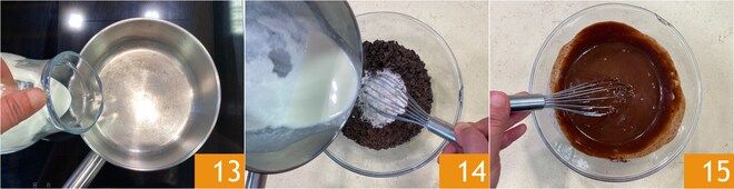 Verted la nata en un cazo 13 y llevad a ebullición, luego unidla al chocolate 14, mezclad con una varilla hasta que se haya derretido 15. Dejad enfriar hasta que el glaseado se haya espesado ligeramente.