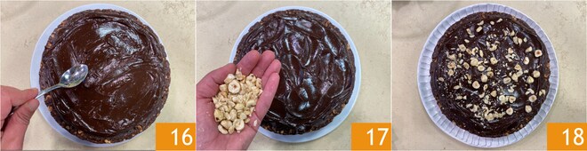 Retomad la base de la nevera, desmoldadla y ponedla sobre un plato de servir. Extendéis el glaseado sobre la superficie de la base 16, decorad con algunas avellanas picadas 17 y guardad en la nevera durante al menos 1 hora. ¡Vuestra tarta de salchichón de chocolate está lista para ser servida 18!