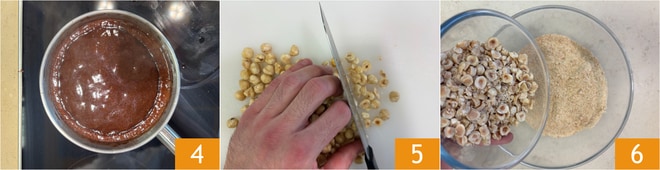 Mezclad con una varilla para amalgamar todos los ingredientes y llevad a ebullición 4. Apagad el fuego y dejad enfriar. Mientras tanto, en un bol desmenuzad las galletas, de manera que obtengáis una mezcla rústica con migas no demasiado grandes. Picad groseramente las avellanas 5 y añadidlas al bol 6.