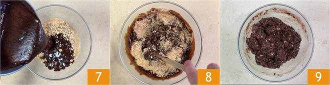 Añadid también la mezcla de leche y cacao ya tibia 7 y mezclad cuidadosamente 8, de modo que obtengáis una masa bastante sólida 9.
