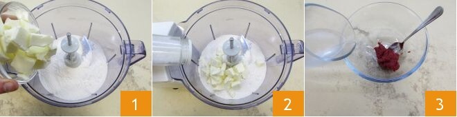 Para preparar la tarta salada de tomate con stracciatella, comienza con la masa brisè. Toma un procesador de alimentos y coloca la harina, añade la mantequilla fría de nevera cortada en pequeños trozos 1 y ajusta de sal 2. Mezcla hasta obtener una mezcla arenosa y harinosa. Toma un pequeño bol, coloca el concentrado de tomate y el agua fría 3.