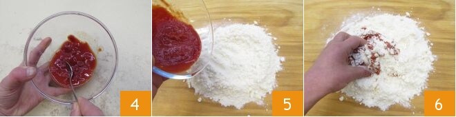 A continuación, mezcla hasta diluir completamente el concentrado de tomate 4; coloca la mezcla de harina y mantequilla sobre una superficie de trabajo (o sobre una superficie de metal o vidrio, siempre que esté fría) y crea un hueco en el centro. Vierte el concentrado 5 y amasa enérgicamente con las manos 6.