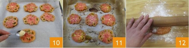 Espolvorea los tomates con azúcar moreno 10 y hornéalos en modo grill a 270° durante 5-6 minutos. Luego sácalos del horno y déjalos enfriar 11. Mientras tanto, toma el bloque y con la ayuda de un rodillo, extiende la masa brisè sobre una superficie de trabajo ligeramente enharinada, obteniendo un grosor de 1 cm 12.