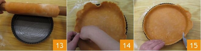 Toma un molde de 25 cm de diámetro, úntalo con mantequilla y enharínalo. Enrolla el disco de masa brisè de tomate en el rodillo y desenróllalo delicadamente sobre el molde 13. Ajusta bien al fondo y a los bordes del molde, ejerciendo una ligera presión con los dedos en los bordes 14; con un cuchillo pequeño, corta los bordes sobrantes de la masa brisè 15.