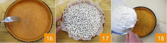 Pincha el fondo con los dientes de un tenedor 16, luego procede ahora con la Cómo hacer la cocción a ciegas coloca una hoja de papel de horno sobre la masa brisè y pon encima esferas de cerámica (o legumbres secas) 17. Hornea en horno estático precalentado a 200° durante 25 minutos (es desaconsejable utilizar la alternativa en horno ventilado). Una vez lista, sáquela del horno, deja que se enfríe un poco y quita las esferas, luego déjala enfriar en el molde. Añade la stracciatella 18, extendiéndola uniformemente sobre toda la superficie del molde, ayudándote con una espátula para nivelarla.