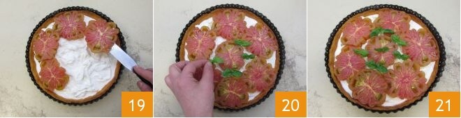 Coloca las rodajas de tomate una junto a la otra de forma concéntrica hasta llenar completamente la superficie de la tarta salada 19; decora con hojas de albahaca 20, ¡por último disfruta de la tarta salada de tomate con stracciatella 21!