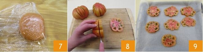 Cuando hayas obtenido una mezcla compacta, firme y bastante elástica, forma un bloque, envuélvelo con papel film transparente 7 y déjalo reposar en el frigorífico durante al menos 40 minutos. Mientras tanto, prepara los tomates caramelizados. Toma los tomates y enjuágalos bien con agua corriente abundante, luego córtalos en rodajas de aproximadamente 2 cm de grosor 8 y colócalos sobre una bandeja de horno forrada con papel de horno uno al lado del otro 9.