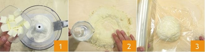 Para preparar la Tarta salada de cebolla de Tropea y Silano comienza a preparar la Pasta brisa. Toma un procesador y agrégale la harina y la mantequilla cortada en trozos groseramente y fría de la nevera, ajusta de sal 1 y mezcla los ingredientes hasta obtener una masa arenosa y harinosa. Vierte la mezcla en una superficie de trabajo dando forma de fuente añadiendo poco a poco el agua helada 2. Cuando los ingredientes estén uniformemente mezclados, coloca la masa en forma de bola en film 3 de cocina y déjala reposar en la nevera por al menos 40 minutos.