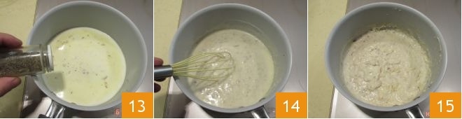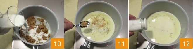 Coloca mientras tanto a calentar la leche en un cazo. Cuando hayas diluido bien, añade la leche calentada 10, aromatizada con nuez moscada 11. Ajusta de sal 12,