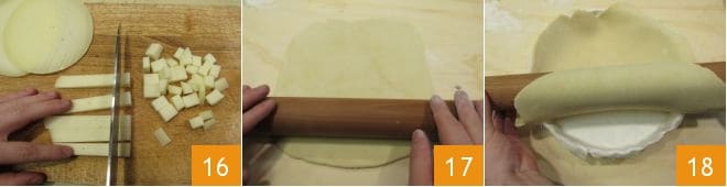 Mientras tanto, corta en trozos 150 g de silano primero en tiras horizontales y luego en dados 16 y 200 g de silano en rodajas finas. En este punto tienes todos los ingredientes necesarios para componer tu tarta salada de cebolla de Tropea y Silano. Ayudándote con un rodillo, extiende la masa quebrada 17. Ahora toma un molde redondo de 27 cm de diámetro y cúbrelo con papel de horno. A continuación, enrolla el disco de masa en el rodillo y desenróllalo sobre el molde 18, haciéndolo adherir bien.