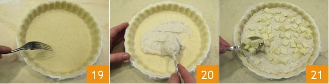 Con un tenedor, pincha la masa quebrada extendida 19. Luego añade la bechamel previamente preparada y extiéndela uniformemente sobre la masa 20. Agrega encima de la bechamel el silano cortado en dados 21.