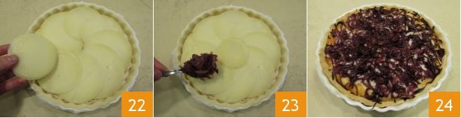 Añade ahora también el silano cortado en rodajas 22. Coloca encima de estos ingredientes extendidos sobre la masa quebrada también la cebolla salteada previamente 23. Ahora hornea tu tarta salada de cebolla de Tropea y Silano en horno estático precalentado a 180° C durante 40 minutos (o en horno ventilado a 160° durante 30 minutos). ¡Sirve y disfruta 24!