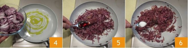 Mientras la masa quebrada reposa en la nevera, pasa a preparar el relleno, comenzando con la cebolla de Tropea. Quítale la capa más externa, luego córtala en rodajas no demasiado finas. Toma una sartén antiadherente, rocíala con un poco de aceite de oliva virgen extra y pon a cocinar tu cebolla de Tropea cortada en rodajas 4, cocinando a fuego moderado. Desglasa con el vino tinto 5 y, cuando la cocción esté casi terminada, añade una pizca de azúcar para caramelizarla 6. Remueve ayudándote con una cuchara para que la cebolla quede uniformemente cocida. Cuando la cebolla de Tropea esté cocida, colócala en un bol y deja que se enfríe un poco.