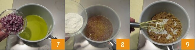 Pasa ahora a la preparación de la Bechamel. Coloca un poco de aceite en una sartén y dora la cebolla finamente picada 7. Añade la harina 8 y mézclala con la cebolla integrándola bien para no crear grumos 9.