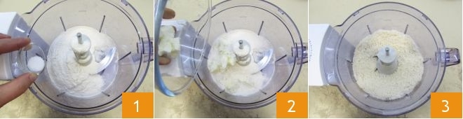 Para preparar la tarta salada caprese comienza a realizar la masa brisa. Coloca en la batidora la harina, la sal 1, la mantequilla fría cortada en cubitos 2 y comienza a mezclar hasta obtener una mezcla arenosa y harinosa 3.