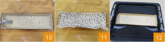 Pincha la base de la tarta salada con los dientes de un tenedor 10, cúbrela con un rectángulo de papel de horno, ligeramente más grande que el molde, y procede con la Cómo hacer la cocción a ciegas. Vierte las esferas de cerámica (o los garbanzos secos) sobre el papel de horno 11 y hornéala en horno estático precalentado a 180° durante 30 minutos (si usas horno ventilado, cocina a 160° durante unos 25 minutos). Una vez sacada del horno, retira las esferas 12 y deja enfriar.