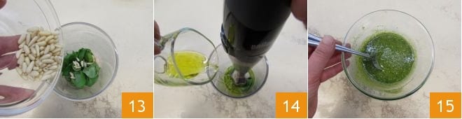 Mientras tanto, dedícate a preparar la crema de albahaca. Lava y seca delicadamente las hojas de albahaca, luego viértelas en el vaso de una batidora junto con los piñones 13, añade también el aceite en hilo y comienza a mezclar 14 hasta obtener una crema lisa. En este punto, transfiérela a un cuenco 15 y salpimienta.