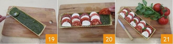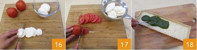 Corta la mozzarella en rodajas 16 y déjala escurrir en un colador, justo el tiempo de terminar las otras preparaciones. Corta también el tomate en rodajas 17 y resérvalo. Recupera tu base de masa brisa, ya fría, y comienza a verter la crema de albahaca 18.