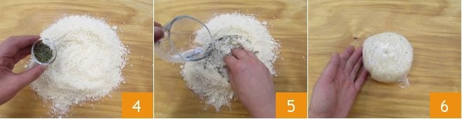 Trasládala luego a una superficie de trabajo, dale la clásica forma de fuente y añade el orégano seco en el centro 4. Vierte el agua fría y comienza a amasar rápidamente 5, para no calentar la masa. Trabájala hasta compactarla, luego envuélvela en film transparente 6 y deja que repose durante 40 minutos en el frigorífico.
