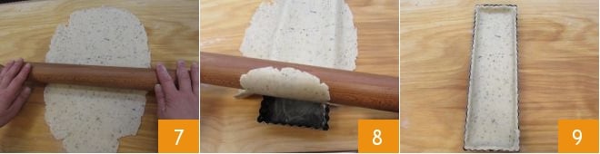 Transcurrido el tiempo de reposo, saca la masa del frigorífico y extiéndela sobre una superficie ligeramente enharinada, hasta obtener un espesor de aproximadamente medio cm 7. Envuelve la masa en el rodillo y llévala a un molde rectangular de 35x11 8, presiona ligeramente con los dedos para que la masa se adhiera bien al molde y corta los posibles excesos de masa 9.