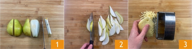 Para preparar la tarta salada de peras y gorgonzola, lo primero que hay que hacer es cortar las peras en cuartos 1, eliminar el corazón y obtener rodajas finas 2 de aproximadamente 2-3 mm de grosor. Rallar el queso fontina 3, picar toscamente las avellanas y reservar.