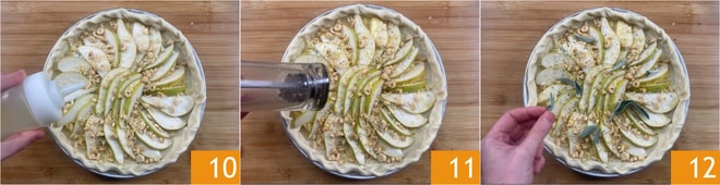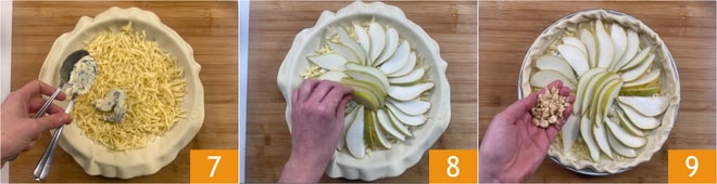 Añadir 5-6 cucharadas de gorgonzola 7 y luego disponer las rodajas de pera en forma de abanico y cerrar también el centro 8. Enrollar el borde en forma de cordón. En la superficie distribuir las avellanas picadas 9.