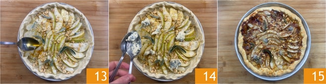 Completar con miel de castaño 13 y un poco más de gorgonzola 14. Cocer en horno estático, en la rejilla central, a 200°C durante 30 minutos, hasta que esté dorado. Dejar templar y tu tarta salada de peras y gorgonzola está lista para degustar 15.