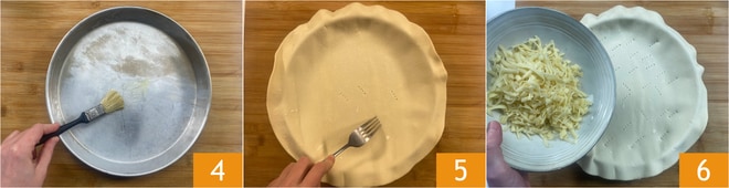Engrasar un molde redondo de 26 cm de diámetro 4. Forrarlo con el hojaldre y pinchar el fondo con los dientes de un tenedor 5. Cubrir el fondo con el queso fontina 6.