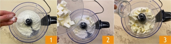 Para preparar la tarta salada con jamón y queso, empezad por la masa brisa: en un procesador, poned la harina y una pizca de sal 1. Agregad la mantequilla fría cortada en trozos 2, luego añadid el agua fría 3.