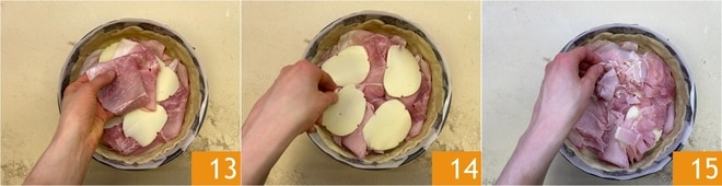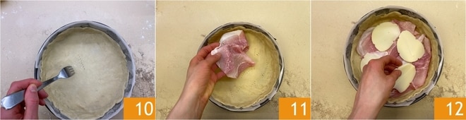 Pinchad la base con el tenedor 10 y distribuid una primera capa de jamón 11, luego continuad con una segunda capa de queso en lonchas 12.
