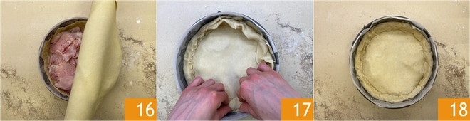 Ahora cubrid la tarta con la segunda hoja de masa brisa 16. Unid los bordes de las dos masas y dobladlos hacia adentro 17 para crear una especie de cordón alrededor del borde 18.