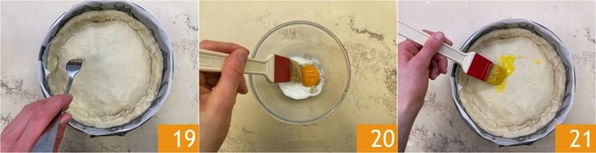 Pinchad también la superficie con el tenedor 19. En un bol mezclar leche y yema 20 y pintad la tarta con esta emulsión 21.