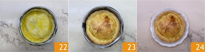 Coced en el horno estático precalentado a 170° durante una hora 22. Pasado este tiempo, sacad del horno 23 y dejad templar vuestra tarta salada de jamón y queso antes de servirla 24.