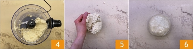 Activad el procesador para amasar rápidamente los ingredientes 4, luego transferid la mezcla a la superficie de trabajo y amasad a mano 5 para crear un bloque homogéneo. Envolved el bloque en papel film 6 y dejad reposar una hora en el frigorífico.