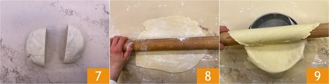 Retomad el bloque del frigorífico y divididlo a la mitad 7. Cubrid con papel de horno un molde desmontable de 22 cm de diámetro. Estirad las dos porciones de masa con el rodillo hasta un diámetro de 25-26 cm 8. Enrollad la masa brisa en el rodillo y desenrolladla sobre el molde 9.