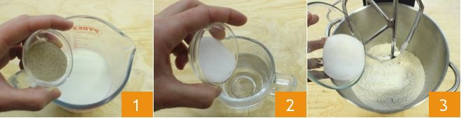 Para realizar la tarta sándwich, comenzad a preparar el pan brioche: disolved la levadura deshidratada en la leche (alternativamente podéis utilizar 12 g de levadura de cerveza fresca) 1, aparte en otro cuenco disolved la sal en el agua 2. En una batidora equipada con batidor K verted las harinas tamizadas, el azúcar 3,