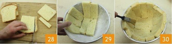 eliminad la corteza 28 y luego divididlas a la mitad obteniendo rectángulos con los que forrar el interior del molde, el fondo y todo el borde. Tomad un molde para zuccotto de 21,5 cm de diámetro, engrasadlo y forradlo internamente con triángulos de papel de horno. Colocad las rebanadas de pan brioche en el fondo del molde y en todo el borde 29, Pincelad el pan brioche con el caldo de pescado 30