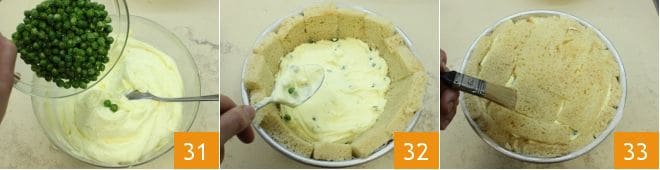 Ahora verted los guisantes cocidos en la crema de mascarpone con azafrán 31, teniendo cuidado de reservar un par de cucharadas de guisantes que servirán para la decoración, y mezclad con una cuchara de madera. Rellenad con la crema de mascarpone y guisantes 32, cubrid la superficie con las rebanadas de pan brioche, pincelad nuevamente con el caldo de pescado 33 y colocadlo en el frigorífico para que se solidifique durante al menos 1 hora.