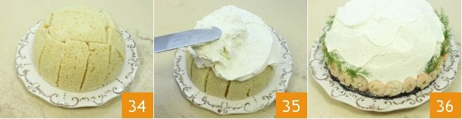 Pasado este tiempo, desmoldad la tarta en un plato de servir 34, untad toda la superficie con la crema de mascarpone reservada 35, extendid la crema con una espátula. Ahora comenzad a decorar la base con semillas de amapola, una capa de gambas, una de eneldo 36,