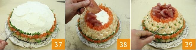 luego colocad rosetones hechos con las lonchas de salmón ahumado, colocad los guisantes ayudándoos con unas pinzas de cocina 37, dos de gambas, luego otro de rosetones de salmón y terminad colocando lonchas de atún ahumado 38 en la superficie. Terminad decorando los espacios vacíos con otros guisantes 39. Vuestra tarta sándwich está lista para ser servida.