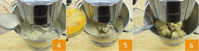 la leche en la que habéis disuelto la levadura 4, los huevos batidos 5 y accionad la batidora para mezclar los ingredientes, verted también el agua con la sal 6. En este punto, reemplazad el batidor K con el gancho para amasar la mezcla y añadid la mantequilla, un trozo a la vez.