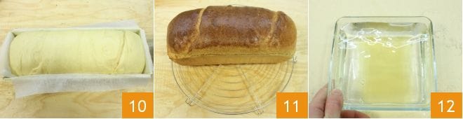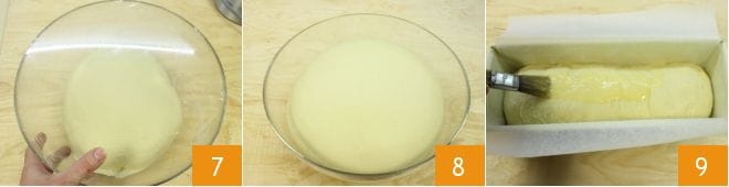 Cuando la masa esté compacta y bien amalgamada, trasladadla a una tabla de amasar, dadle forma de bola y colocadla en un cuenco de vidrio, cubrid el panecillo con film transparente 7 y dejadlo levar durante una hora y media en el horno apagado con la luz encendida. Pasado el tiempo de reposo, la masa habrá duplicado su volumen 8, modelad el panecillo para darle forma cilíndrica y colocadlo en un molde engrasado y forrado con papel de horno. Pincelad la superficie con el huevo batido 9 y volved a dejarlo levar durante media hora en el horno apagado con la luz encendida.