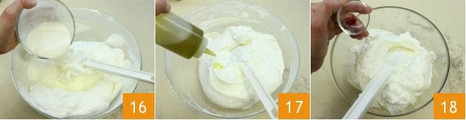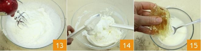 Con una batidora eléctrica montad la nata a punto de nieve bien firme 13 e incorporadla al mascarpone 14. Escurrid la gelatina, que mientras tanto se ha ablandado, y disolvedla en 50 ml de nata tibia 15.