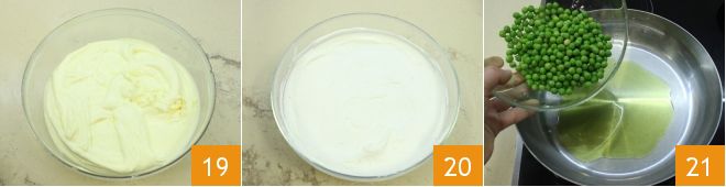 y mezclad para amalgamar el aroma 19, guardad en el frigorífico el cuenco con la otra mitad de la crema 20, que servirá para cubrir la tarta. En una sartén amplia, calentad un hilo de aceite y luego añadid los guisantes 21 y salteadlos hasta que se ablanden, luego dejadlos enfriar.