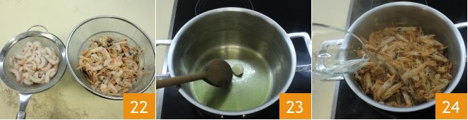 Limpiad los gambas, peladlos y reservad el caparazón 22. Preparad el caldo para el pan brioche: en una cazuela colocad un diente de ajo 23, verted los caparazones, desglasad con vino blanco y luego añadid un litro de agua 24, coced el caldo a fuego lento durante al menos 30 minutos, luego apagad el fuego y filtrad el caldo obtenido y dejadlo enfriar.